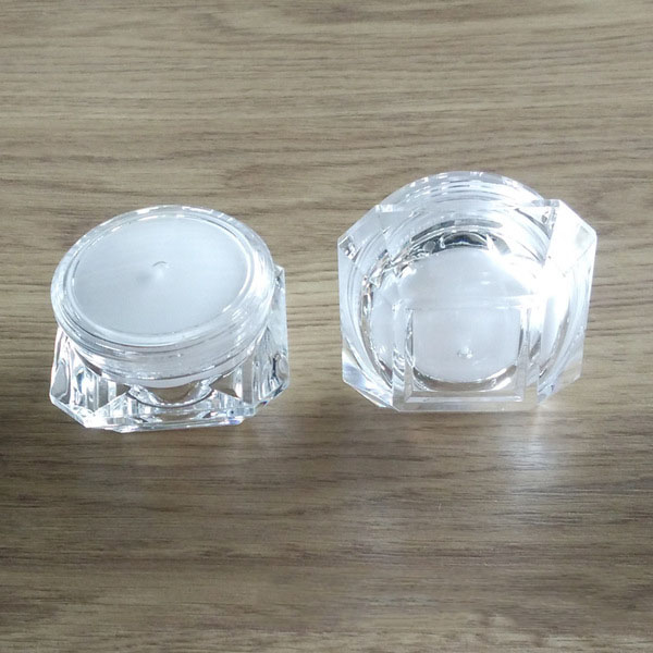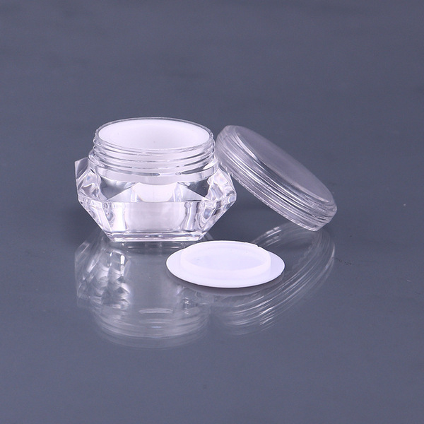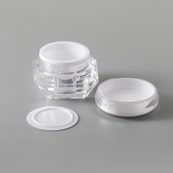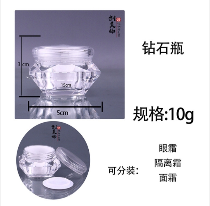 Upgrade your skincare packaging with this 10gm Diamond Shape Clear Acrylic Cosmetic Jar, designed to deliver a premium and elegant presentation. Crafted from high-quality transparent acrylic, the diamond-cut body reflects light beautifully, giving your product a luxurious, crystal-like appearance that enhances brand value.This refillable cosmetic jar features a secure screw-top lid and inner sealing disc, helping prevent leaks and protect creams from air and contamination. Ideal for eye cream, face cream, night cream, gel, balm, and sample cosmetics, it is perfect for both personal use and professional cosmetic brands.Compact, durable, and lightweight, this jar is travel-friendly and suitable for retail, wholesale, or sub-packaging needs. Its clear design allows easy product visibility, making it an excellent choice for modern skincare packaging.