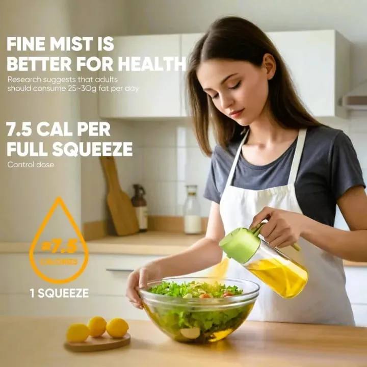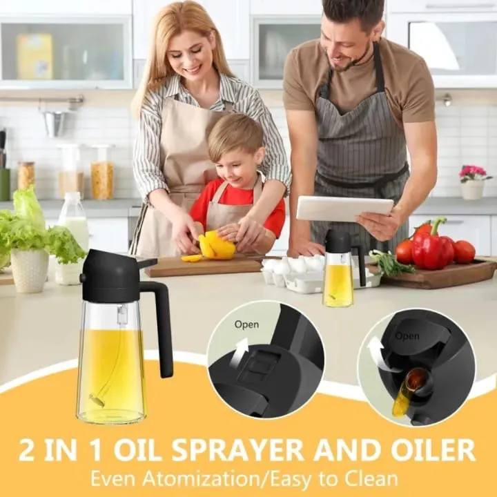 Upgrade your cooking experience with this innovative 2-in-1 Oil Sprayer and Dispenser Bottle, designed for convenience, control, and healthier meals. Whether you need a fine mist for air frying or a smooth pour for cooking, this versatile bottle does it all—no extra tools required.Crafted with a modern, ergonomic design, it features a dual-function lid that lets you switch between spray and pour effortlessly. The transparent body allows you to monitor oil levels easily, while the sturdy handle ensures a comfortable, non-slip grip during use.