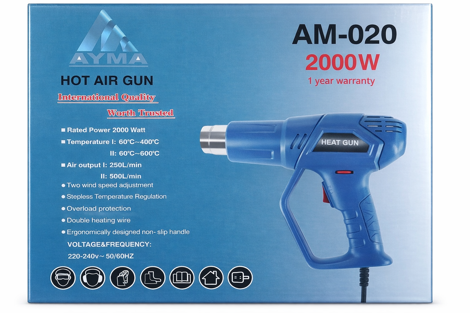 Upgrade your toolkit with the powerful AYMA 2000W Heat Gun, designed for both professionals and DIY enthusiasts. With rapid heating technology and dual temperature settings ranging from 300°C to 500°C (572°F to 932°F), this heat gun delivers consistent and controlled airflow for a wide range of applications.