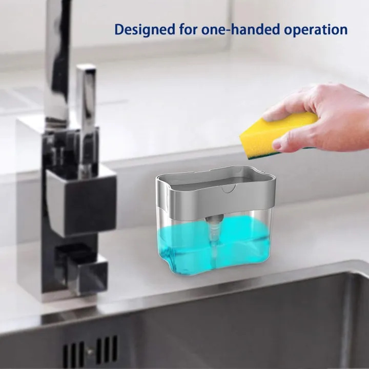 Excellent quality and durable our dishwashing soap dispenser is made of the highest quality ABS+PC plastic, with high strength and corrosion resistance, can maintain the appearance and laster for many years, and even suitable for commercial dish soap dispenser .Dishes Cleaning Done FasterCleaning dishes is about to get a whole lot faster with this Soap Pump & Sponge Caddy. Fill it up with 13oz of your favorite dish soap, then use the included sponge to press down on the pump, which dispenses the perfect amount of dish soap up On the sponge. When you need more, just pump again for another shot of soap. No more stopping to grab the soap bottle. Any other sponge or scrubber will work with it too! Save money, space and timeInstant two-in-one water dispenser 1 hand operation Prevents soap waste Use this included caddy to remove the sponge from the sink and keep it dry. Styled storage - best for kitchen decor and farmhouse decor. Super gorgeous, beautiful design.INNOVATIVE DESING ALLOWS FOR ONE - HANDED USE . DISPENSE THE PERFECT AMOUNT OF DISH SOAP DIRECTLY ONTO THE SPONGE BY SIMPLY PRESSING DOWN ON THE TOP PLATE . KEEPS SPONGES CONTAINED .
